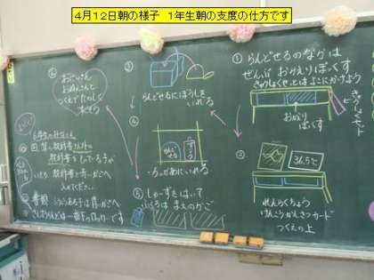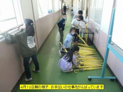 今日も、穏やかな春らしい朝を迎えました。子どもたちの服装も、変わってきました。中には半そでの子もいます。1年生の教室に行くと、朝の支度に一生懸命です。黒板には、その手順が説明してありました。6年生の子に手伝ってもらいながら、少しずつ一人でできるようになってきました。2年生は、お手伝いの仕事していました。返事もよく気持ちがいいです。大好きな絵本を先生と一緒に読んでいる子もいました。