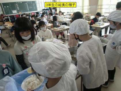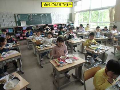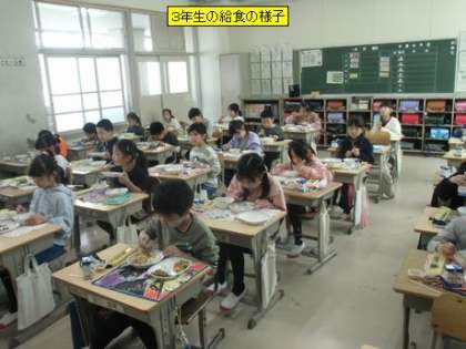 3年生の教室では、給食当番さんの配膳が終わり、給食が始まっていました。今日のメニューは、麦ごはんととよたひまわりポーク丼ときびなごのからあげと桃ゼリーです。子どもたちは、おいしそうに食べていました。
