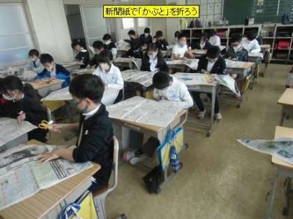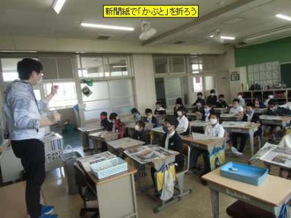 新聞紙で「かぶと」を折ろう(4年1組)
