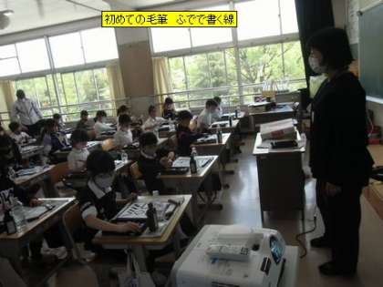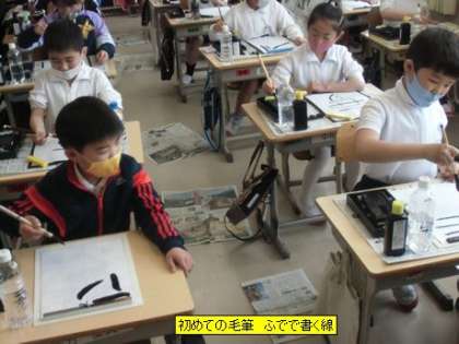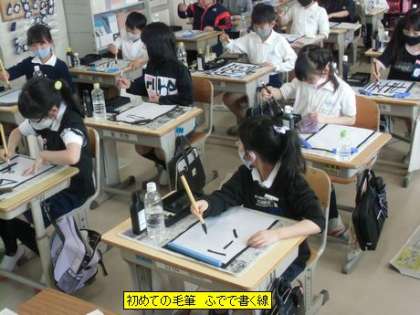 3年生の書写で初めて毛筆を使うことになります。今日は、初めて筆に墨をつけて半紙にいろいろな線を書いてみました。力の入れ方や筆の角度によって線の太さや濃さが変わってきます。子どもたちは、筆の感触を楽しみながら思い思いの線を書いていました。
