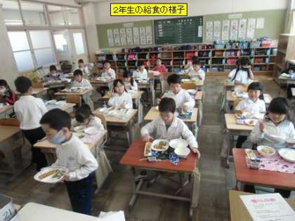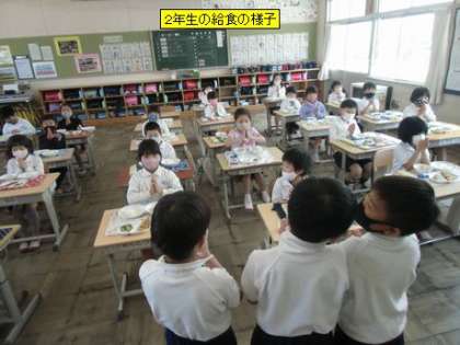 給食当番さんの合図で給食が始まります。今日のメニューは、おやこにとごはんで親子丼、にぎすフライ、いそかあえです。