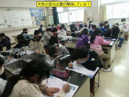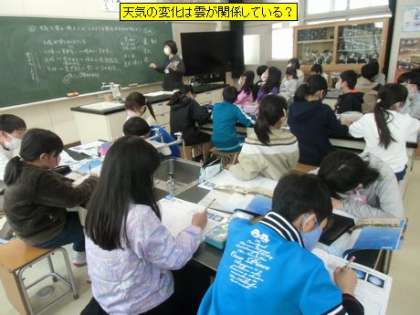 5年1組の皆さんが、理科室で理科の授業を行っていました。今日の単元は「天気の変化」。天気の変化は、雲が関係していることは子どもたちは知っています。雲が多くなれば、曇ってきたり、雨が降ったりします。今日の空は雲がないので、晴れです。5年生は、しばらくの間空を見上げることが増えると思います。