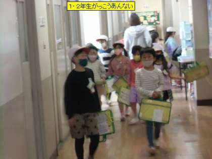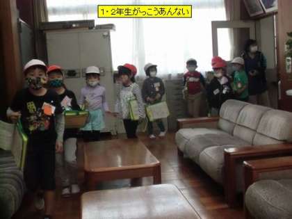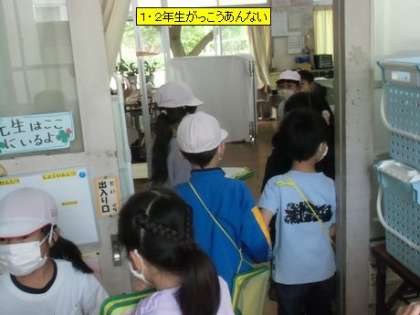今日は、2年生のお兄さん・お姉さんが学校の中をいろいろ回って、1年生の子が学校について学習する「がっこうあんない」が行われています。2年生の子が、1年生の子にいろいろな教室や場所の説明をしながら学校中を案内します。所々にクイズがあったり、先生のサインをもらったりして、楽しく回ることができているようです。校長室に来た1年生の子たちは、しっかりと自己紹介ができました。