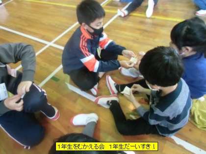 第1部の後半は、1年生と6年生のふれあいタイムです。6年生が作った「びゅんびゅうんゴマ」を一緒に回して遊びました。なかなか上手に回せない1年生には、6年生が優しく教えて回せるようになりました。最後は、1年生の子全員が6年生にお礼を言って、第1部を終えました。1年生と6年生の距離がまた一段と縮まった楽しい時間になりました。