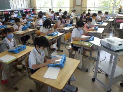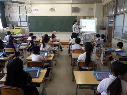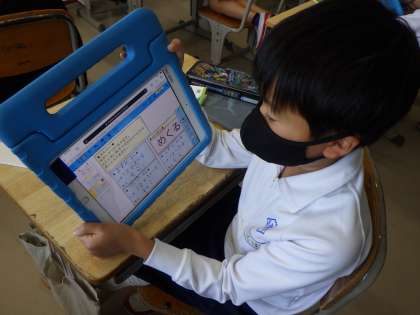 タブレットを使いながら、割り算の考え方を説明しています。