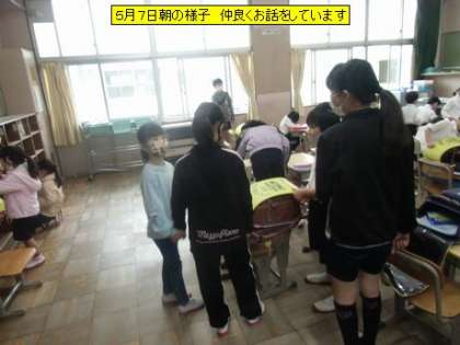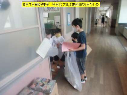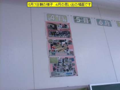 教室を回っていくと、たくさんの子がゴールデンウィークの楽しい話を聞かせてくれました。今日は、アルミ缶回収の日です。忘れずにたくさんの子が協力してくれました。先日の1年生を迎える会後、1年生と6年生の仲がまたよくなった感じがします。5月に入り、4月の思い出の場面が写真で掲示されています。5月もいろいろな経験をして積み重ねてほしいと思います。