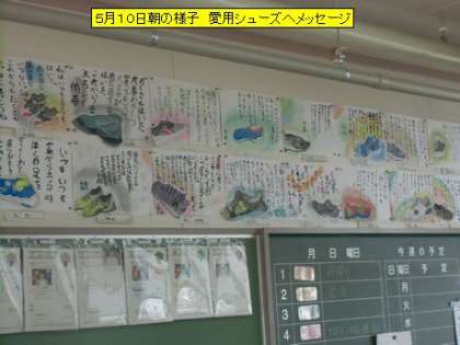 教室を回ると、1年生の子があさがおの水やりをしていました。しっかりお世話をして芽が出るのを楽しみに待ちましょう。教室には、図工の時間に作った子どもたちの力作が掲示されています。2年生は、「ふしぎなたまご」。殻をを破って出てきたものは?6年生は、愛用のシューズをデッサンし、そこには子どもらしいメッセージが添えられていました。