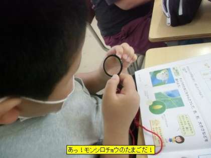 3年3組の皆さんが、虫メガネで何かを見ていました。近寄って見ると、葉の裏に産みつけたモンシロチョウのたまごでした。子どもたちは、初めて見るモンシロチョウのたまごに釘づけです。思わず歓声をあげる子もいました。しっかり観察をしてノートに記録をしていました。