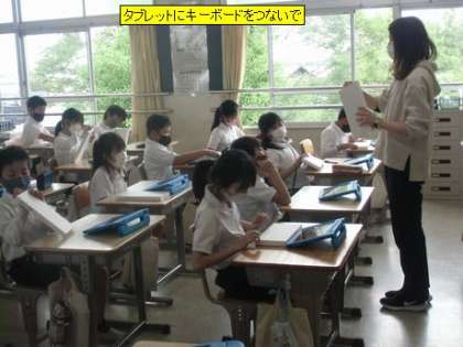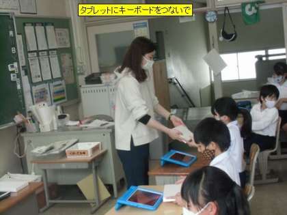 4年3組では、タブレットにキーボードをつないで起動していました。子どもたちは、キーボードにも慣れているようでスムーズに操作をしていました。