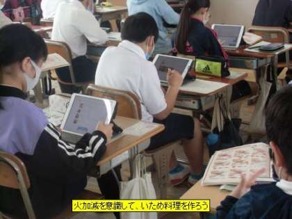 6年4組では、野菜炒めのレシピづくりに挑戦していました。炒め料理は火加減が難しく、野菜のシャキシャキ感を残すことが大事です。今日は、タブレットでクックパッドをを見ながら、家庭で作るいため料理のレシピを作成します。材料や器具、家族分の分量も考えます。レシピができたら、家で作ってみて感想を聞かせてください。