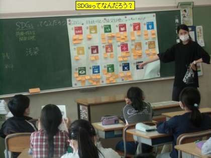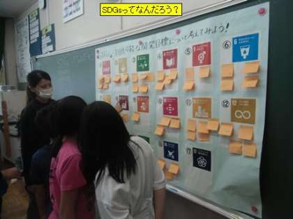 6年3組では、総合の授業で、最近よく耳にする「SDGs」について考えていました。持続可能な17の開発目標が示されています。今日は、克服しなければいけないと思われる課題について、自分の思うところを付箋に書いて貼りました。自然災害のことや環境汚染のこと、もちろんコロナのことも子どもたちは考えていました。この6年生の総合の学習がどういう方向に進んで行くのか、楽しみにしたいと思います。