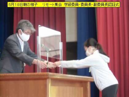 今日は、今年最初のリモート集会を体育館と各教室をつないで行いました。校長講話として、すえの賞のことについて話しました。自分のため、学級のため、学校のためになる目標を掲げて取り組むことで素晴らしい寿恵野小学校になること、そして、教職員はすえのっ子の応援隊であることを伝えました。認証式では、前期学級委員、委員会の委員長・副委員長に認証状を渡しました。学級、学校のために力を貸してください。よろしくお願いします。