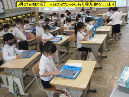 1年生の子どもたちも、一人一台のタブレットを持ち、学習に活用し始めています。自分のタブレットを持ち、どことなくうれしそうです。今日は、全校でタブレットの持ち帰り訓練を行う予定でいます。家庭でのタブレットの使用環境についての確認をお願いします。今日も、1日がスタートしました。