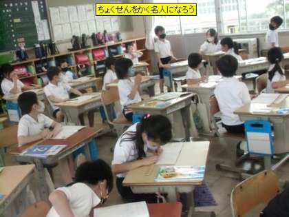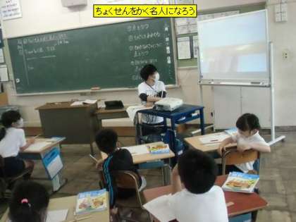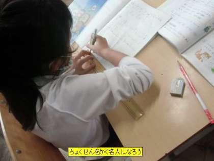 2年3組では、30cmものさしを使って、きれいな直線をかく練習をしていました。8cmの長さを点と点で結んだ直線を引きます。線を引いているとものさしが動いてしまって、なかなか上手にかけません。ものさしのおさえ方や鉛筆の動かし方を工夫しながら何本も練習しているうちにきれいな直線がかけるようになりました。