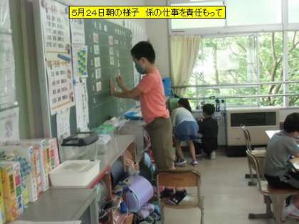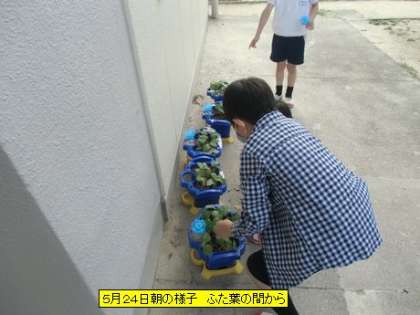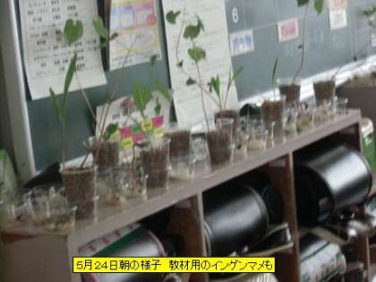 校舎内を回ると、教材用の植物がこの土日に大きく変化をしています。1年生が育てているアサガオのふた葉の間からまた新しい葉が出てきました。多くの子がそれに気づいていました。月曜日から子どもたちは自分の仕事に一生懸命取り組んでいます。その表情は真剣です。