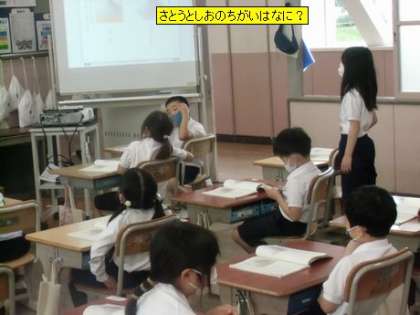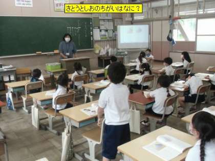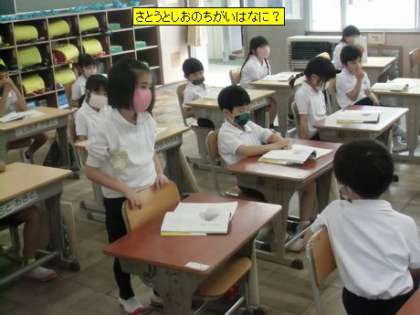 1年2組の国語では、「さとうとしお」の学習をしていました。まずは、「さとう」と「しお」について知っていることをどんどん発表していました。見た目のことや味、触った感触など、子どもたちはたくさんのことを知っていました。