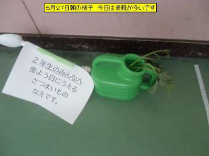 今日は、朝から雨が降っています。下駄箱には、たくさんの長靴が並んでいました。こんな雨の日の過ごし方は、読書がおすすめです。タブレットを使うこともありです。2年生の教室前に「さつまいもの苗」が置いてありました。明日職員室南側の畑に、大橋園芸の大橋様にご指導いただいて植えます。今回は、緊急事態宣言中ということもあって、ビデオ出演でのご指導をお願いしています。