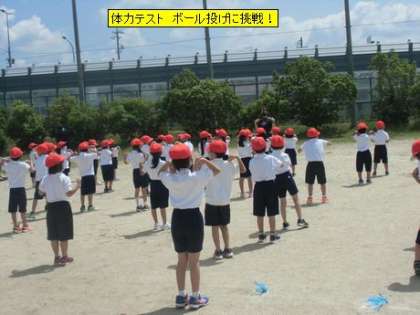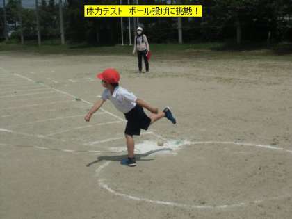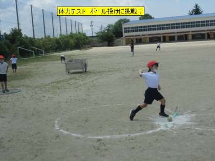 1年3組と4組の皆さんが、体力テストのボール投げに挑戦していました。丸い円の中から目標方向に投げます。ひじがしっかり上がっていて、いいフォームで投げている子がいてびっくりしました。