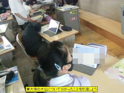 6年2組の皆さんは、東大寺の大仏について調べたことをタブレットにまとめていました。今日は、その調べたことをクラスで共有します。子どもたちが最初にこだわったのはやはり大きさです。目の大きさ、口の大きさ、身長など。百聞は一見にしかず。修学旅行の目的が一つはっきりしました。
