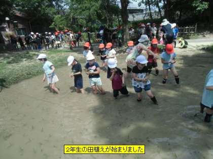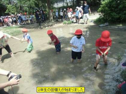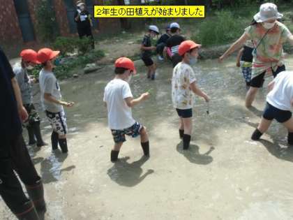 今日は、2年生と5年生が行うビオトープの田んぼの田植えの日です。まずは2年生。事前に大橋園芸の大橋様に苗の持ち方から植え方までを教えていただいているのでスムーズにやれると思ったのですが・・・。初めての田んぼに興奮が止みません。土の感触を少しずつ確かめながら、決められたポイウントに植えることができました。これから田んぼの苗の観察も行っていく2年生です。