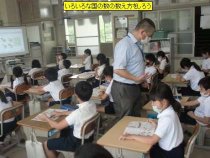 3年1組の皆さんがフェリックス先生と一緒に外国語活動の勉強をしていました。今日は、いろいろな国の数の数え方を教わっていました。アメリカはもちろん、中国、韓国、インド、スペインです。数を数えるときに指を折って数えますが、国によって指の使い方が違うんですね。初めて知りました。子どもたちは、興味深そうにビデオを見ていました。