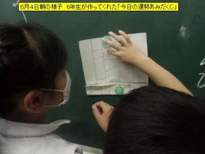 図書室前には、今6年生が取り組んでいるSDGsコーナーが作られています。「SDGs」に興味をもってくれる子どもたちが増えるといいと思います。1年生の教室に行くと、たくさんの子が「あみだくじ」をしていました。「今日は、大吉だ!」と喜んでいました。6年生のお兄さん・お姉さんが1年生の子のために作った「今日の運勢あみだくじ」でした。