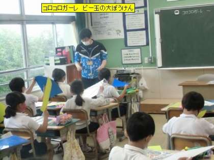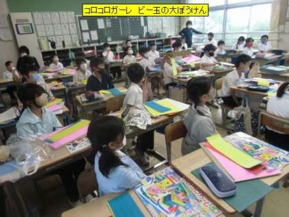 4年1組に行くと、新しい図工の単元「コロコロガーレ」のセットが配られたところでした。セットの中身を確認しながら、子どもたちはどんな作品にしようか、イメージをふくらませているようでした。担任の先生が作った試作品から考えている子もいます。「ビー玉の大ぼうけん」 ビー玉のいろいろな転がりを工夫して楽しみましょう。