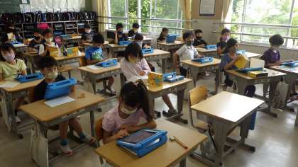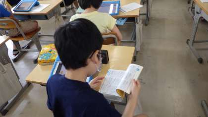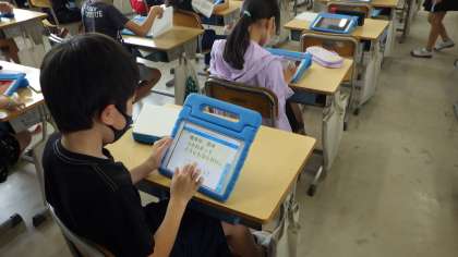 慣用句の学習をしていました。国語辞典で意味を調べ、タブレットに3択クイズを作成していました。