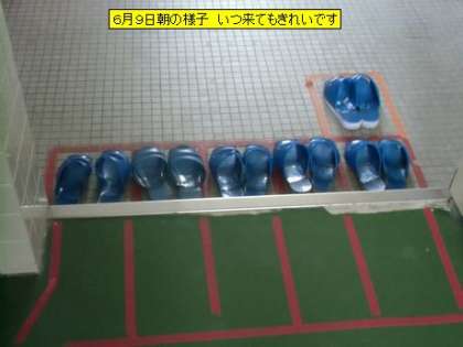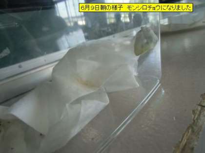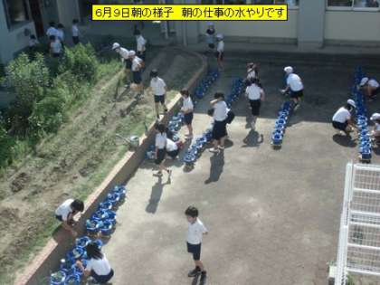 校舎を回ると、植物への水やりで中庭は賑わっています。今日は、植物も水を欲しがっています。中校舎2階のトイレのスリッパは、いつきても整っています。何年生が使っているのでしょう。3年1組の虫かごから、モンシロチョウが飛び立とうとしています。今日が、記念日ですね。