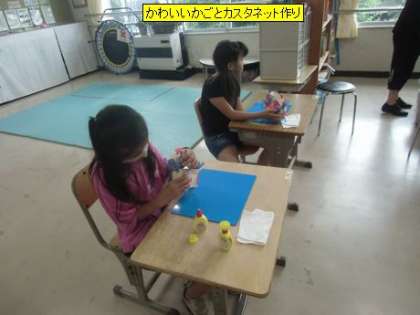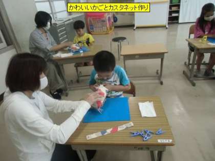 今日、6.7.8組では、幸町の小島様からご提供いただいた「かご」と「カスタネット」の材料を使って、かごとカスタネット作りに挑戦しています。見本を見ながら、ていねに作っていくと、だんだんかごの形になってきました。みんなとてもうれしそうです。小島様は、すべてリサイクル用品を工夫して材料を作ってみえます。本当にありがとうございます