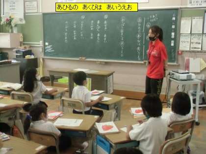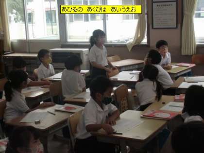 1年3組では、国語の「あひるの あくび」を学習していました。「あ」がつくことばをつなげて「あ行」完成させます。まずは、「あ」がつくことばをいくつか書き出してそれをつなげていきました。「あさがお あおいよ あいうえお」「はなびは ぱちぱち はひふえほ」子どもってすごいですね。いろいろ言葉を見つけてあ行からわ行を完成させてしまいました。