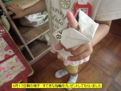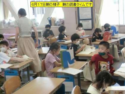 教室を回ると、タブレットを使った朝の学習が始まっていました。どの子も、画面に集中しています。借りてきた本を読んでいるクラスもあります。この落ち着いた時間が大事です。今日、スクールガードのおじいさんから折り紙で作った指輪をもらってご満悦の子がいました。とても気にいったようで大事にかばんにしまっていました。
