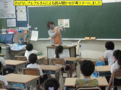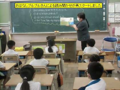 緊急事態宣言が解除されましたので、今日からおはなしプルプルさんによる読み聞かせが再スタートしました。早速、子どもたちはおはなしプルプルさんの読み聞かせに釘付けです。