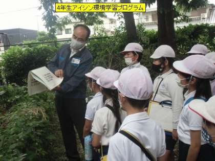 本日、4年生は、豊生ブレーキ様、アスクネット様に講師として来ていただき、「アイシン環境学習プログラム」の授業を受けています。実際にビオトープに出ていき、いろいろな生き物の習性やエサ、すみかなどについてクイズを交えて、分かりやすく、しかも楽しく教えていただきました。本校の自慢のビオトープについていろいろ学んでほしいと思います。