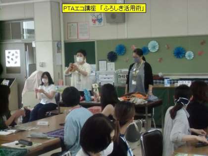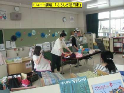 今日は。PTA主催のエコ講座「ふろしき活用術」が、とよたエコライフ倶楽部の皆様を講師としてお迎えして図書室で行われています。ふろしきが、リュックになったり、ペットボトル入れになったり、ティッシュカバーになったり。一枚の布が、折り方や結び方を工夫するといろいろな形に変わり、用途が増えていくことが分かり感動しました。ぜひ、やってみたいと思いました。