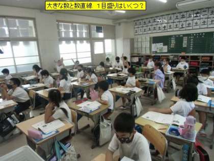 3年3組の算数の学習は、「大きな数」の勉強です。今日は、数直線上の数字を読み取る内容です。子どもたちは、数字を読み取るためのポイントをいくつか一生懸命に考えていました。分かっている数直線上の数字と目盛りの数を一生懸命数えていました。