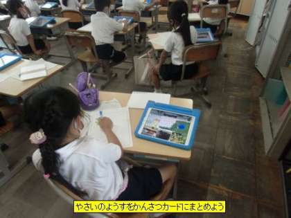 2年生は、ミニトマト・オクラ・ピーマンを自分の野菜として育てています。2年3組では、自分の野菜の様子を、撮ってきた写真とメモを見て観察カードにまとめていました。葉の色や手触り、花の様子などをカードに書き込んでいました。タブレットの写真機能を使うと、観察の時の様子がよく分かります。