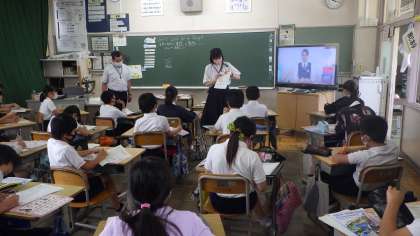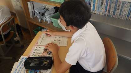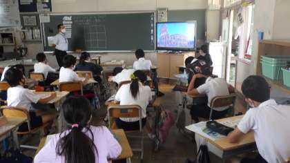 Let's go to Italy.という内容の学習をしていました。動画を見たり、聞こえた英語をワークシートに書いたりしていました。