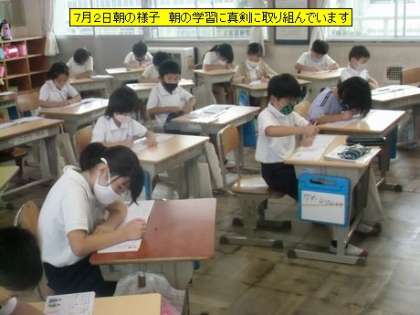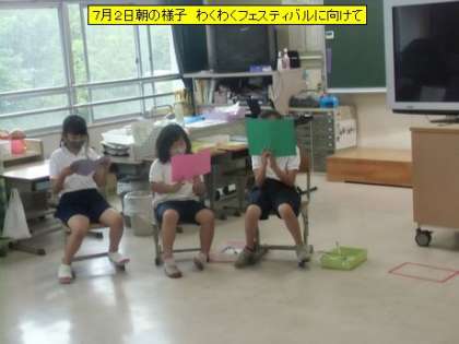教室を回ると、朝の学習が始まっていました。とても集中して漢字の練習に取り組んでいます。6・7・8組の皆さんは、わくわくフェスティバルの練習をしていました。今日が最終日です。昨日は、地域の方からたなばた用の笹竹をいただきました。子どもたちは、どんなお願いごとを短冊に書くのでしょう。