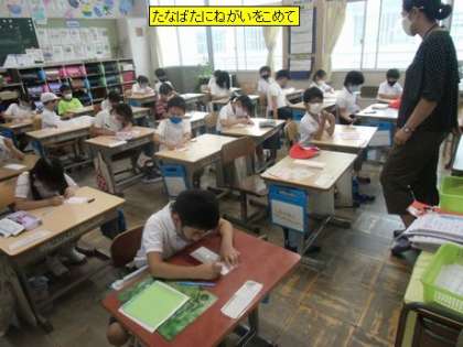 2年2組も、地域の方からたなばた用の笹竹をいただきました。この時間は、短冊に願い事を書く時間です。どの子も真剣に考えて、ていねいに短冊に書き始めました。「コロナがおさまりますように」「いきいきランドにホタルがみつかりますように」子どもの願いは、真っ直ぐで本物です。