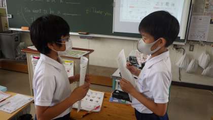 What do you want to be?を使い、友達とコミュニケーションを図っていました。アイコンタクトもきちんとして、相手のことを理解しようとしていました。