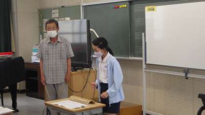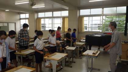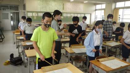地域講師の方にリズムを教えていただきながら、実際に叩いて練習していました。