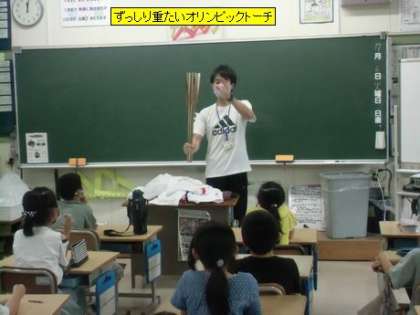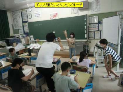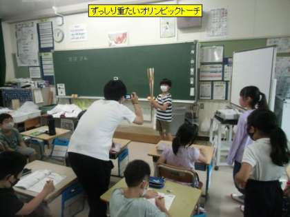 3年3組の子どもたちが掲げているのは、オリンピック。パラリンピックの聖火トーチです。本物です。トヨタ自動車にお勤めの吉田博樹様が、実際に石巻市の聖火リレーに参加されたときに使用したトーチです。今回は、吉田様の「ぜひ、子どもたちに」というご好意で借用させていただいています。子どもたちは、「すごい!」「持ちたい!」「けっこう重いね」などの感想を口々に話していました。もうすぐ始まるオリンピック・パラリンピックが身近に感じられればと思います。吉田様、ありがとうございます。トーチは、今日から3日間各クラスを回ります。
