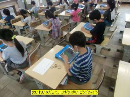 1年4組では、ICT支援員の村松先生にも来ていただき、タブレットを使ってプログラミングの学習をしていました。「ビスケット」というプログラミングソフトを使って、自分で作ったオリジナルキャラクターを自由自在に動かします。自分の作ったキャラクターが、上にも下にも斜めにも自由に動く様子を見て、子どもたちは驚きの声を上げていました。