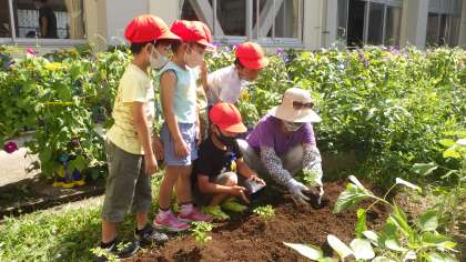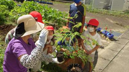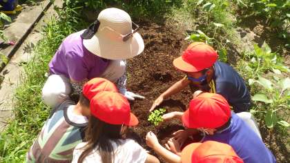 1−2の子供たちが「モリンガ」という植物を植えました。モリンガは、普通の木の20倍の二酸化炭素を吸収する、環境によい木です。大きくなるといいですね。