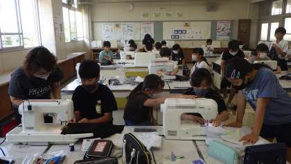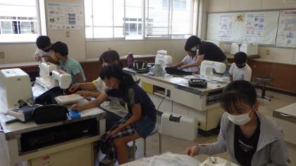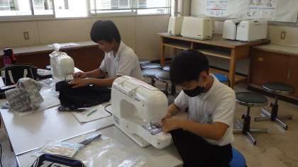 地域講師の方の協力もいただきながら、ミシンでエコバックを作製しています。修学旅行で使うので、真剣に作業をしていました。