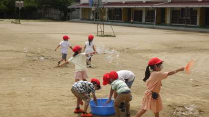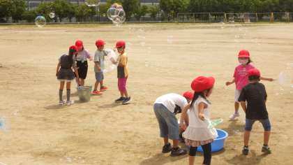 生活科の学習でシャボン玉を作って遊びました。自分が持ってきた道具を作っていろいろな形のシャボン玉を作りました。