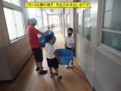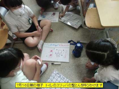 教室を回ると、先生のお手伝いで大きなたらいを運んでいる子がいました。顔は、にこにこしていました。今日は、アルミ缶回収の日です。たくさんのアルミ缶、ありがとうございます。4年生は、トイレのスリッパの整とんの呼びかけをしようと準備をしていました。意識の統一が大事です。