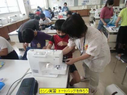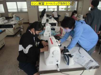 今日は、地域学校共働本部のミシンボランティアの方の協力をいただいて、ミシン実習を行っています。ボランティアの方にミシンの使い方を手取り足取り教えていただきながら作業を進めていました。このトートバッグは修学旅行で使う予定です。