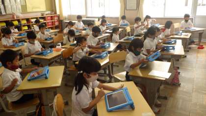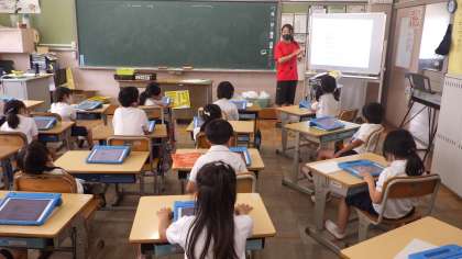 今年から夏休みのしおりがタブレット配信になりました。どのように使うのか先生の説明を一生懸命聞いて操作していました。